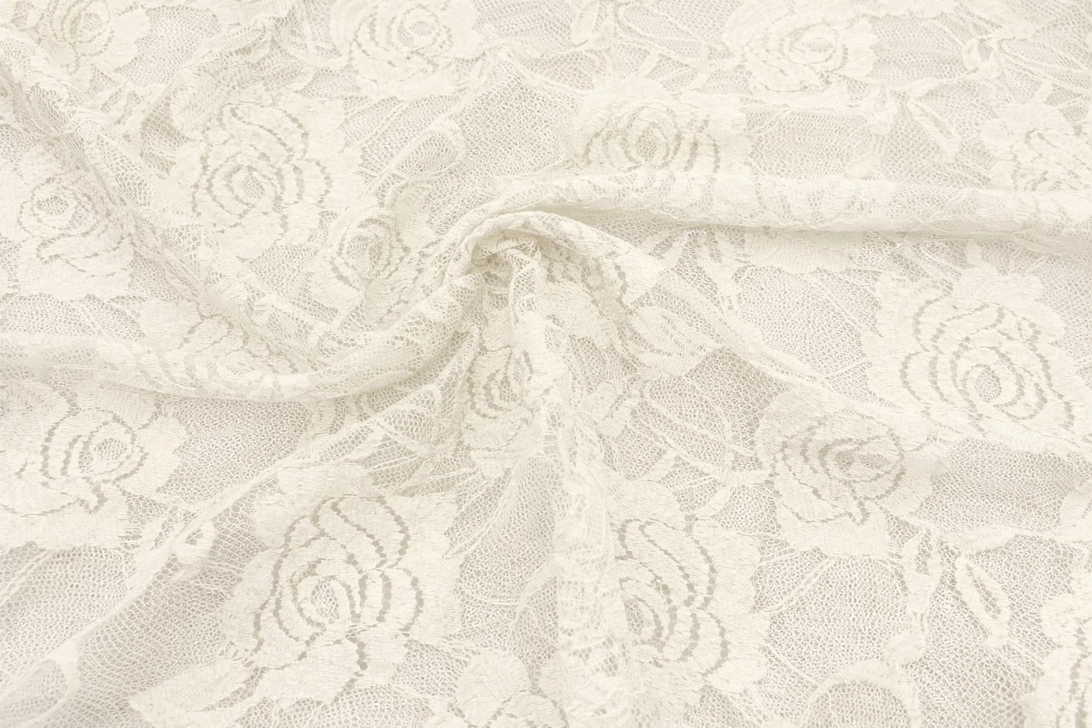 Our Nylon Spandex Knit Lace in Cloud Dancer is a soft, elegant stretch lace featuring a classic floral design.